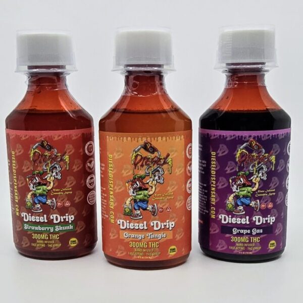 Diesel Drip – Nano Infused Syrup: Ultra-potent 300mg THCA liquid syrup with fast-acting nano infusion. Mix into drinks or sip straight for a quick, clean, and powerful high. Vegan, organic, and lab-tested. Available in Orange Tangie, Grape Gas, and Strawberry Skunk.